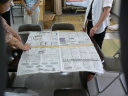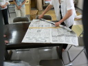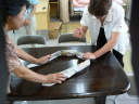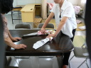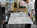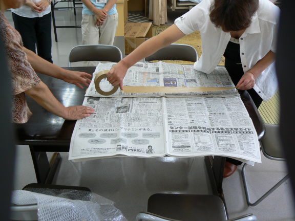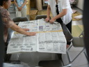 ② 2列に並べた新聞紙をつなげる(かさね合せ中央をガムテープでつなげる)